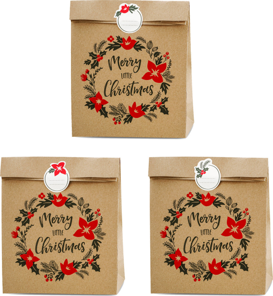 Prisen er for en pakke med 3 stk. kraft gaveposer i 25x11x27 cm med Merry Little Christmas julemotiver. Der medfølger 3 stk. gavemærker (klistermærker) til at sætte på poserne.